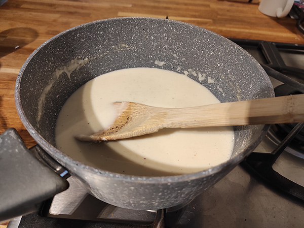 I often to use this for Lasagne so like to load it up with a good whack of Cheddar Cheese, around 100g to taste. I you want to add cheese, be sure to take the pot off the heat and add the cheese bit by bit or you will end up with a split sauce. After you add each bit (about 25g) make sure you slowly stir it in until it has completely melted, then add the next bit and repeat until all the cheese has gone.